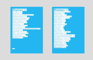DISPLAYER 03, The points of departure for the third issue of Displayer are the demands, challenges, and the potentialities as well as the impossibilities of exhibiting space itself. In this context, space is not considered as a mere geometric entity but rather as a conflicting field of relations, situations and events. The exhibition of space becomes strongly connected to performative acts and to questions about the requirements of constructions in space. Space is the fabric in which events occur; and events, in turn activate space culturally, socially, politically and geographically. More than 20 interviews, statements and essays were produced exclusively for Displayer 03. The contributions of the artists, architects and writers have arisen from intensive several-day workshops, as well as panel discussions, email and phone conversations, dialogic talks, public presentations, debates and seminar projects that were initiated through the programʼs curriculum.