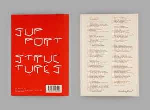 SUPPORT STRUCTURES is a manual for what bears, sustains, props, and holds up, for those things that give ‘support’. While the work of supporting might traditionally appear as subsequent, unessential, and lacking value in itself, this manual is an attempt to restore attention to one of the neglected, yet crucial modes through which we apprehend and shape the world. The book offers support through potential methodologies, inspirations and activations for practice, and addresses important questions for art and architecture practices on forms of display, organisation, articulation, appropriation, autonomy, and temporariness, and the manifestations of blindness towards them. It is a publication project for the creation of the missing bibliography of support structures.