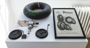 Lunch is being served alongside footage of air raids on 10 and 11 May 1941, sounds of contemporary bombing raids and a display of aircraft tyres and other parts, referencing The Showroom building’s former use as a factory producing parts for wartime aircraft.