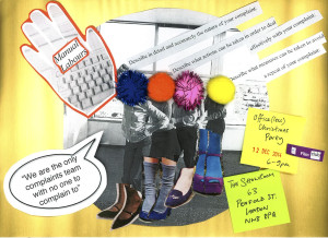 The event marks the second stage of the practice based research project Manual Labours, initiated by Sophie Hope and Jenny Richards, exploring physical and emotional relationships to work and focuses our artistic activity in exploring the complaining body through a series of workshops with complaints teams across different sectors within the UK. These workshops will inform three new commissions by visual artist Sarah Browne, choreographer Hamish MacPherson and writer Ivor Southwood and a programme of Film Clubs, Reading Groups, exhibitions and published texts developed in partnership with The Showroom, London; In Certain Places, Preston and Movement and Division of Labour, Worcester.