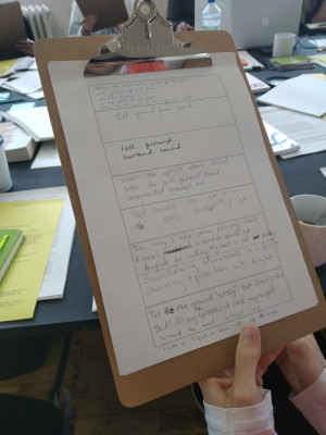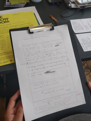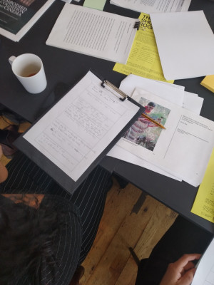 The afternoon involved reflexive and practical engagement with Ferreira da Silva and Neuman’s thinking. There was a guided discussion of the selected reading set in advance of the workshop, a viewing of the film 4 Waters: Deep Implicancy, some time to read, look at and listen to the archive material, and individual and group writing exercises.