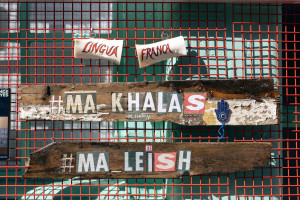 On one façade of the building, text is inscribed into wooden panels to form a poetic manifesto. The title ‘Painting in the Exploded Field’ references the art historian Rosalind Krauss, who developed the terminology of art forms transgressing their traditional borders, with the substitution of ‘Exploded’ introducing the idea of real-life violence. The slogan ‘We Are Everywhere’ is rooted in the queer liberation movement, as well as having resonances with the idea of diaspora; appearing in both English and Arabic at the head of the manifesto. The text uses non-standard grammar and spelling at various points, alluding to the reclamation of English as it is spoken, particularly by non-native speakers, resisting the imposition of ‘correct’ forms.