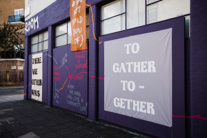 The Showroom Mural Commission is a unique project for artists to activate the building’s emblematic facade. For this second intervention, artist Simnikiwe Buhlungu references strolling as a form of knowledge production and uses text, textile and interactive sound installations to communicate ideas of gathering through a call and response with local communities.