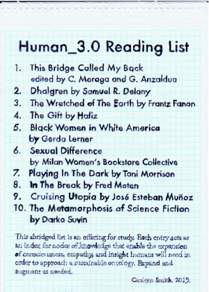 “This abridged list is an offering for study. Each entry acts as an index for nodes of knowledge that enable the expansion of consciousness, empathy, and insight humans will need in order to approach a sustainble ontology. Expand and augment as needed.” – Cauleen Smith, 2015