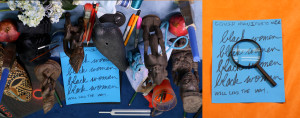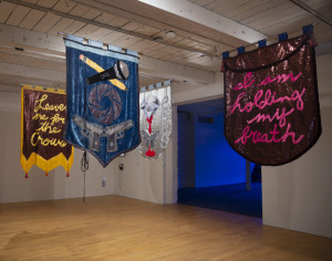 “My banners take up the form of protest, but they’re really an invitation for personal meditation and introspection. I deliberately make my work that way, so that it can’t easily be coopted by a political agenda. I appropriate forms from social institutions that organize masses, and then I undermine them. Groups of people can find common ground, and yet individuals can still maintain and question their own position—as opposed to me telling anyone what to think. Recently, Avery Young] borrowed text from the banners to make a gospel song. It was profound!” – Cauleen Smith on [how art facilitates protest and introspection.