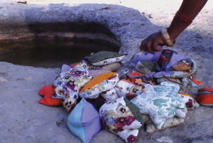 “In Cauleen Smith’s video Egungun: Ancestor Can’t Find Me (2017), a figure shrouded in shells wanders zombielike in a lush African landscape. In Yoruban societies, egungun are costumed dancers who appear at public celebrations. Smith’s is more monstrous—an animated corpse of a slave-ship captive gone overboard during the Middle Passage that has now emerged as a haunting. Transferred from 16-mm film, the video has a grainy texture that enhances the barnacled cloth of the costume.” – ArtNews