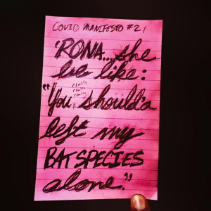 The Rona got me thinking about ## ishmaelreed and jess grew. I am dismayed at the failure of covid19 discourse to confront the reasons for this pandemic. Ecological abuse is a central procedure in extractive capitalism. The failure to comprehend all non-human beings as anything other than a commodity is what got us here. The Rona preys on the most vulnerable and we are not dissimilar to The Rona’s original host— a despised and feared and disregarded creature: the Chiroptera. Beloved Bat cousin. Restore habitats. Rebuild relations with the earth. And send jess grew after the %1 of fools what got us to this sad and lowly situation. – Cauleen Smith, 10 June 2020