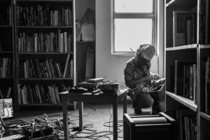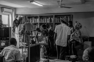 Watch a short video excerpt from the first day of Eyongakpa’s live sessions at CCA Library above; and listen below to a recording generated during subsequent mbi eshobi inter-sessions with Jere Ikongio, Busayo Olowo, Soft Mix, Jibril Adewumi Africana and Joshua Akubo, which drew upon Eyongakpa’s creative methodologies, extending out into a collective recording workshop in neighbouring streets.