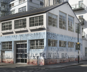 Pamela Phatsimo Sunstrum was commissioned to create a full-scale mural on The Showroom’s facade, for which she was inspired by South African writer Bessie Head (1937-1986). Head rejected the brutality of apartheid by exiling herself to the village of Serowe in Botswana. Titled Exalt B.H. Sunstrum’s mural enveloped the facade of The Showroom with a view of Serowe’s landscape dominated by an ever-present sky, a significant element in Bessie Head’s oeuvre. Weaving in and out of this expanse of blue are Head’s words from Earth and Everything: ‘I am building a stairway to the stars. I have the authority to take the whole of mankind up there with me. That is why I write.’