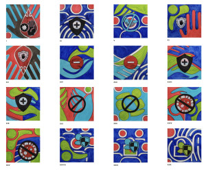 Overlaid on top of the original stencils are new logos collected during more recent research in 2020 looking at the similarity of visual language between Prevent and the Covid-19 pandemic; sharing symbols of protection, care, but also threat, vigilance and resistance to contamination. Much of this visual language of Covid is shared with Anti-terrorism. The work invites consideration of the crossovers between these rhetorical approaches.